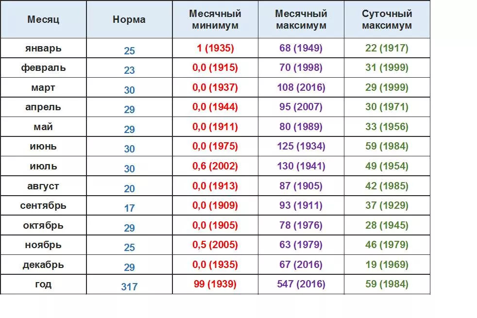 Нормы количества осадков рассчитаны за период 1991‑2020 гг. Суточные данные: взяты за период 1904-2021 гг. Данные отображены в мм.