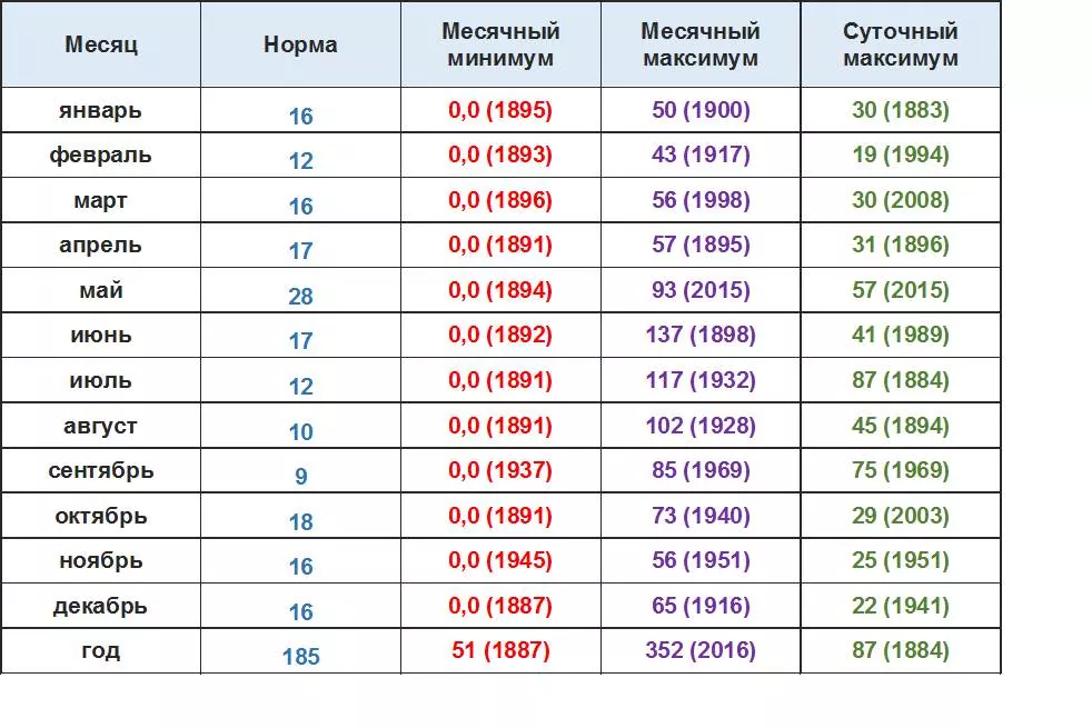Нормы количества осадков рассчитаны за период 1991‑2020 гг. Суточные данные: взяты за период 1881-2021 гг. Данные отображены в мм.