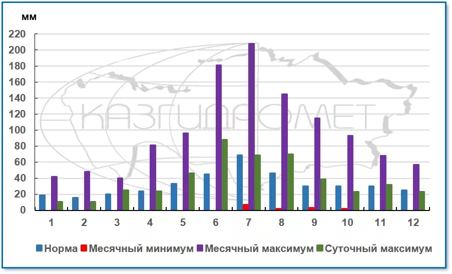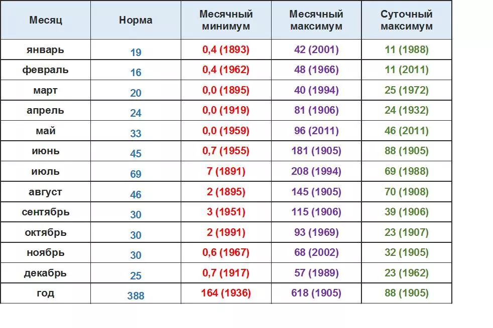 Нормы количества осадков рассчитаны за период 1991‑2020 гг. Суточные данные: взяты за период 1890-2021 гг. Данные отображены в мм.