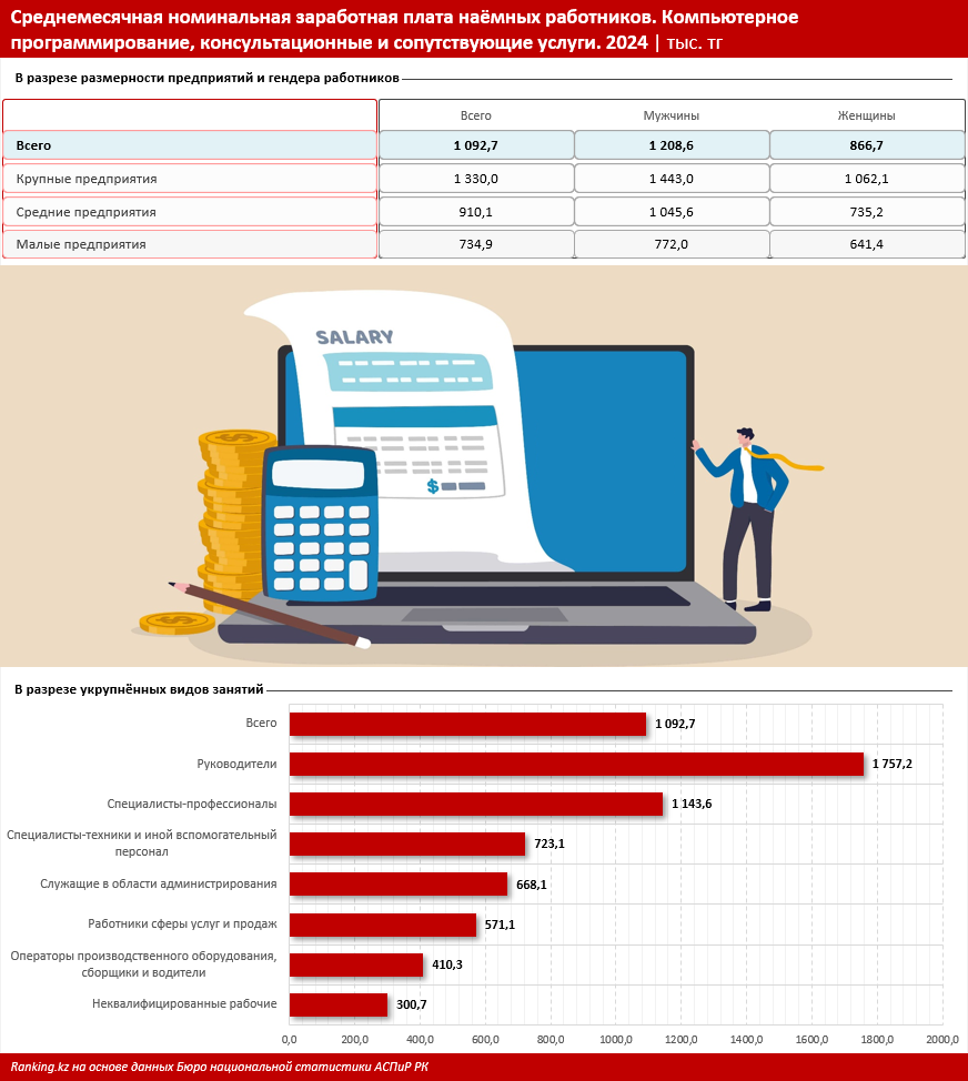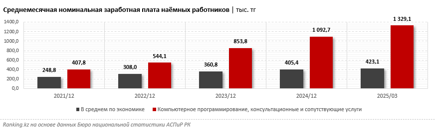 - По сравнению с остальной экономикой, где средний заработок составляет около 423 тыс. тенге, разрыв с IT колоссален: айтишники зарабатывают в 3,1 раза больше.