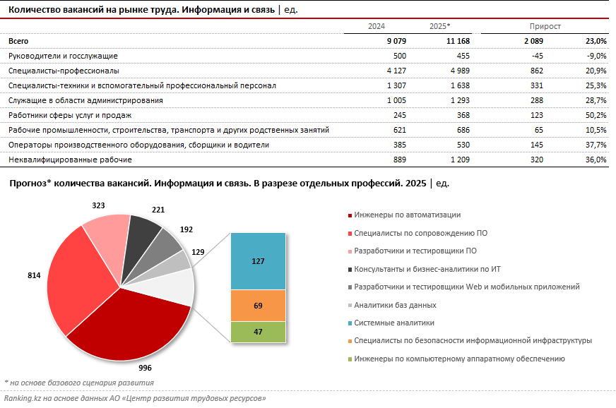 Детализация данных выявляет: бизнес-аналитики ИКТ могут претендовать на 2,7 млн тенге, а вот операторы поддержки — всего лишь на 319 тыс. тенге. Однако реальные вакансии, размещённые на Hh.kz, зачастую предполагают медианные зарплаты, заметно ниже средних по рынку.